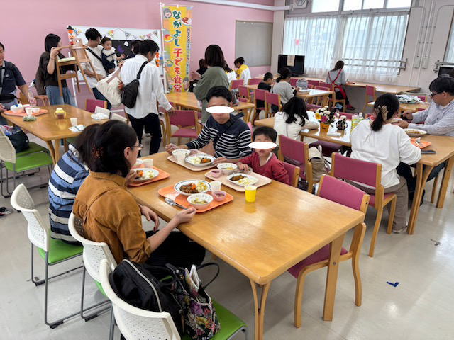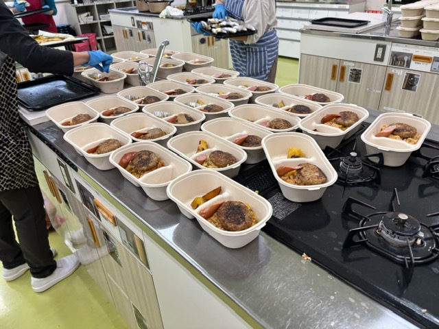 春の温かさに恵まれ、カラットにて「なかよし子ども食堂」が開催されました。メニューはハンバーグ、ミートスパ、ウインナー、混ぜご飯、プリン、ブロッコリー、野菜スープでした。