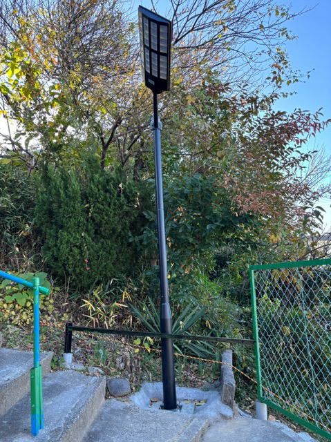 地域からのご依頼により、夜間の照明を仙人塚の私道につけさせていただきました。暗い中での階段の上り下りは危険です。ソーラー発電なので、配線等は必要なく利用できます。これからは明るく安全に通行できます。