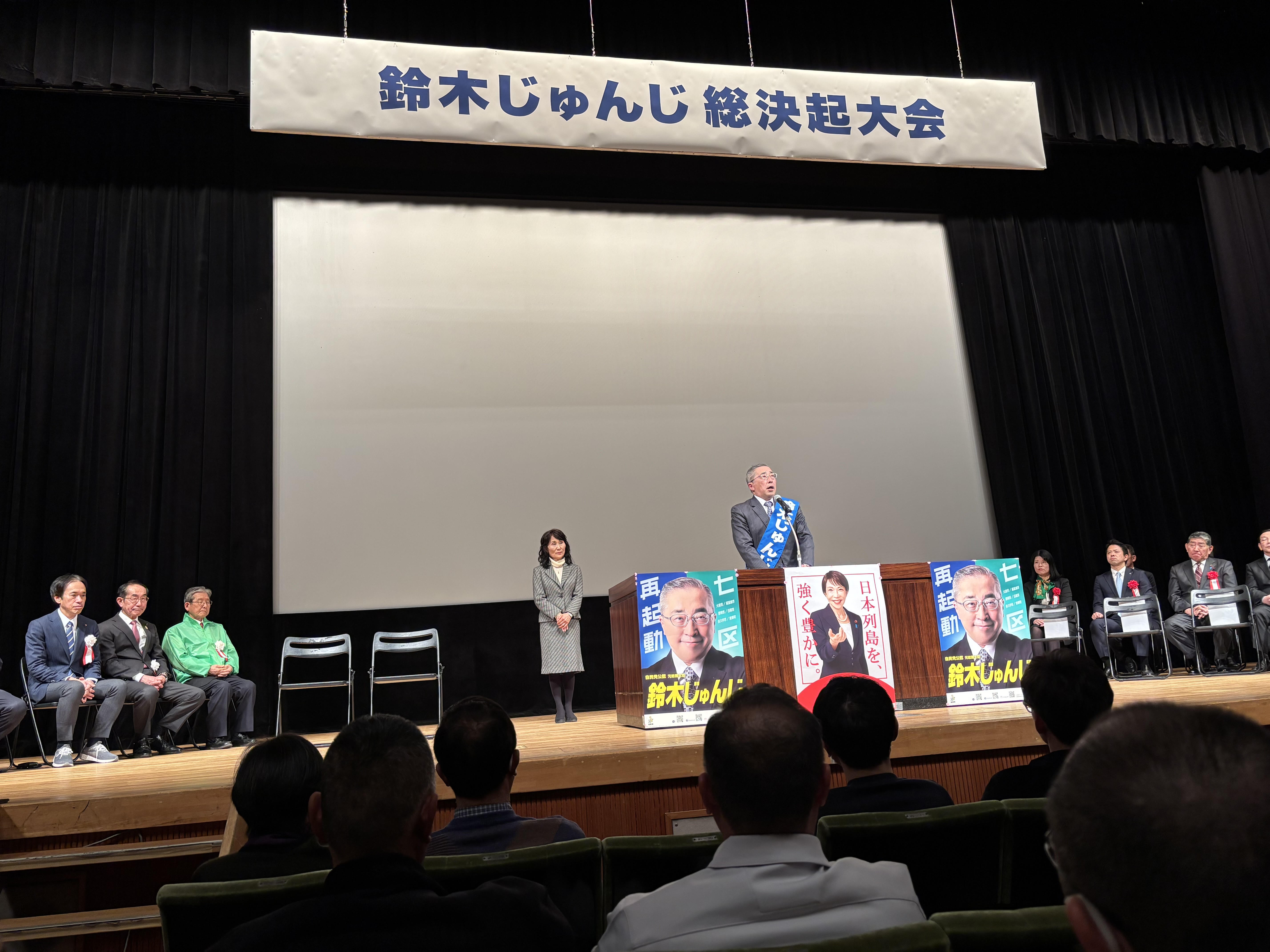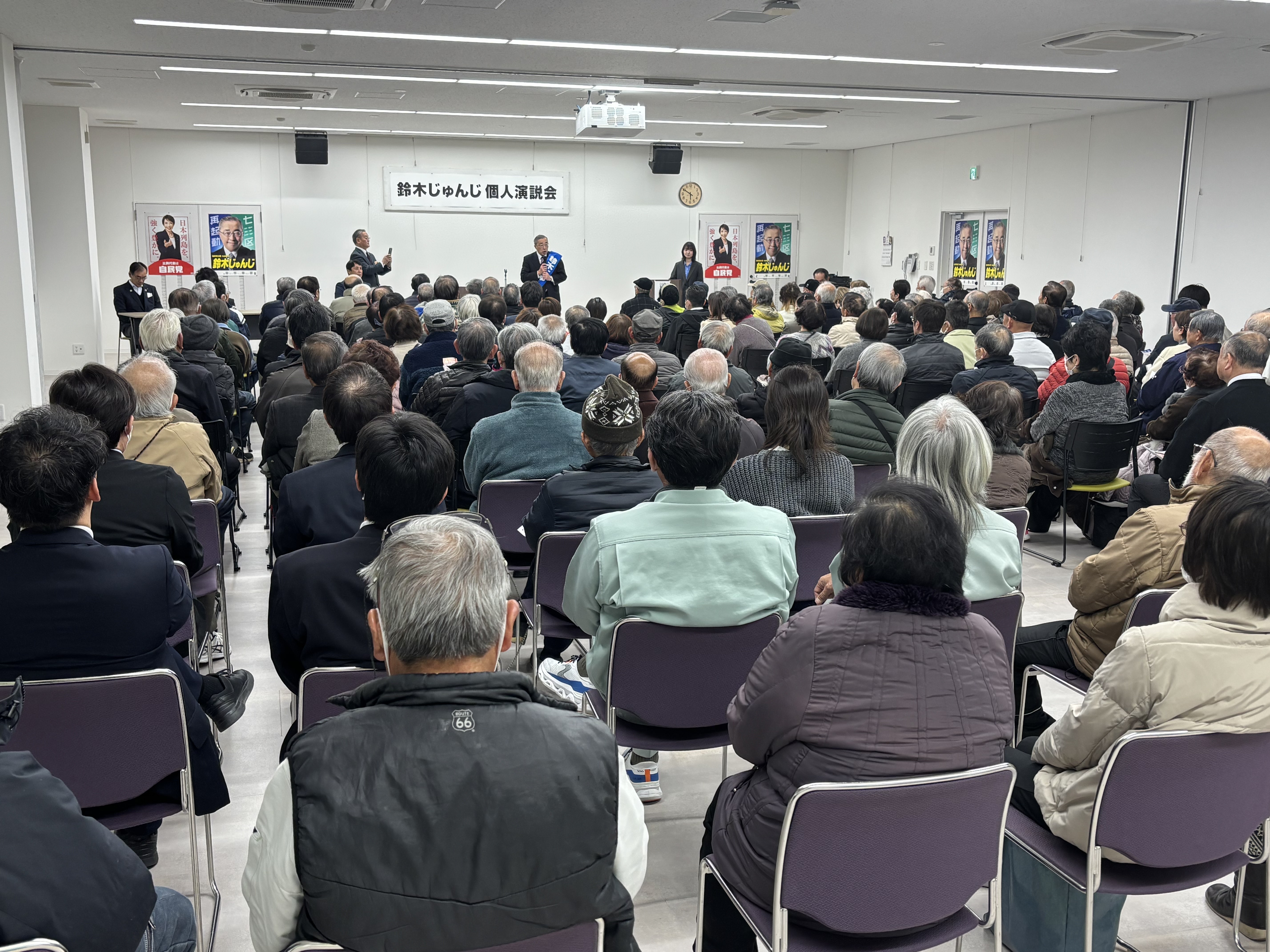 衆議院選挙の中盤線の中、JA愛知豊明2Fにて「鈴木じゅんじ候補」の演説会が開かれました。17時半から始まり、寒い中にも関わらず約170名の参加者がありました。